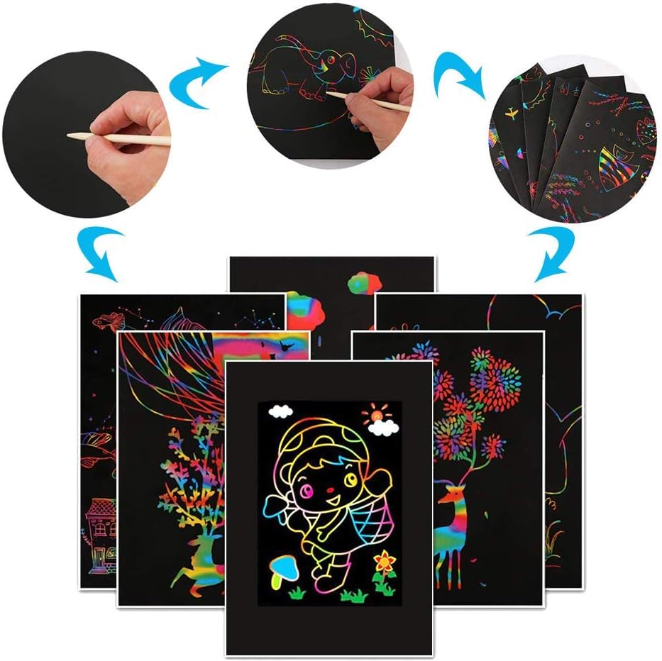 Le Carnet de Dessin Magique à Gratter transforme chaque page en un univers coloré. Il suffit de gratter la couche noire avec le stylet en bois inclus pour révéler des dessins éclatants et surprenants.